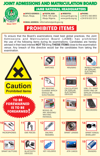 The board has warned that candidates who breach the directive would be disallowed from taking the UTME. Candidates are hereby required to properly examine the list and take note of the prohibited items, in order to avoid complications during the UTME exercise.