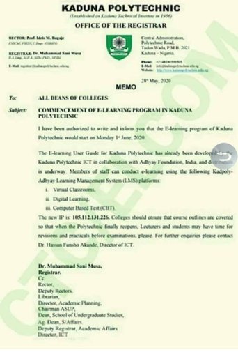 “I have been authorized to write and inform you that the E-learning program of Kaduna Polytechnic would start on Monday 1st June, 2020.