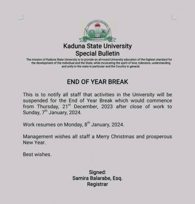 KASU Resumption Date: This is to notify all staff of the Kaduna State University (KASU) that activities in the University will be suspended for the End of Year Break which would commence from Thursday, 21st December, 2023 after close of work to Sunday, 7th January, 2024.