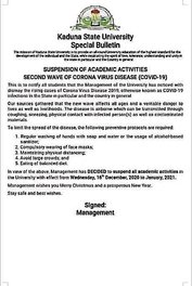 This is to notify all students that the management of Kaduna State University (KASU) has noticed with dismay the rising cases of Corona Virus Disease 2019, otherwise known as COVID-19 infection in the State in particular and the country in general.