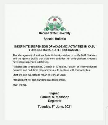 Kaduna State University (KASU) has suspended lectures for undergraduate students indefinitely. See details below.