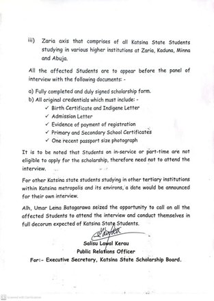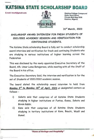 Katsina State Scholarship Board Announces Interview and Verification Exercise, 2021/2022 Session