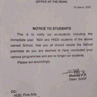 This is to notify our ex-students including the immediate past NDII and HNDII students of the above named School, that you all should vacate the School premises as you are deemed to have concluded your various programmes and are no longer our students.