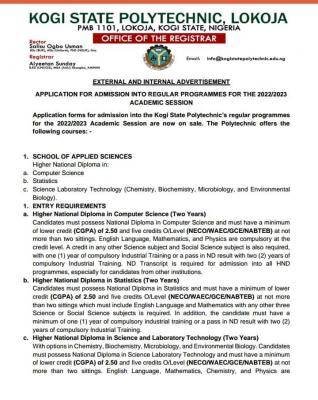 Kogi State Poly Pre-ND Admission Details For 2022/2023 Session