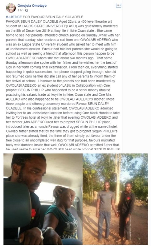 A bizarre story making the rounds on social media alleges that, a final year student of Theater Arts at Lagos State University (LASU) identified as Favour Seun Daley-Oladele, was killed by an ex-student of LASU, Owolabi Adeeko in collaboration with his mother Mrs Adeeko and one Prophet Segun Phillip, said to be a serial money ritualist. The deceased’s body parts was allegedly eaten by Owolabi and his mother in a bid to change their family’s misfortunes.