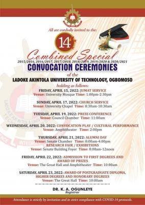 The Vice-chancellor on behalf of the Senate and Governing Council of the Ladoke Akintola University of Technology (LAUTECH) cordially invites all to the institution’s special 14th Combined Convocation Ceremonies for 2015/2016, 2016/2017, 2017/2018, 2018/2019, 2019/2020 and 2020/2021 Graduands.