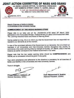 In view of the nonchalant attitude of the Government to our demands, this is to direct our members in all Universities and Inter-University Centres throughout the country to commence a two week warning strike by midnight of Sunday, 27th March, 2022 in the first instance as earlier conveyed to the Federal Government in our letter.