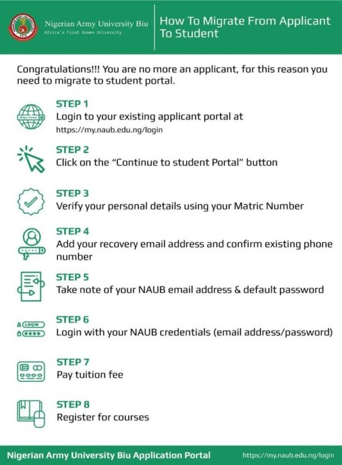 The management of the Nigerian Army University, Biu (NAUB) has released the procedures for the newly shortlisted candidates to migrate as students for the 2019/2020 admission exercise. The procedures for migrating are outlined below. NAUB Applicant to Student Migration Procedures