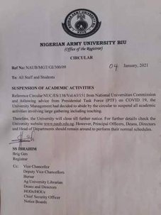The Nigerian Army University, Biu (NAUB) has suspended lectures and all other forms of academic activities. See details below.