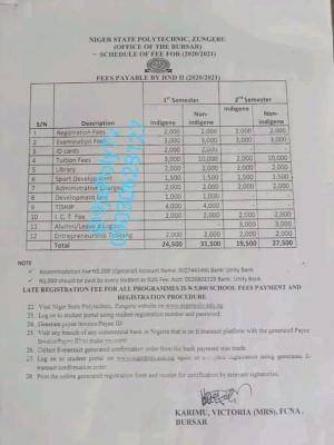 The management of Niger State Polytechnic, Zungeru, has hereby announces the school fees schedule for all levels in the institution for the 2020/2021 academic session.