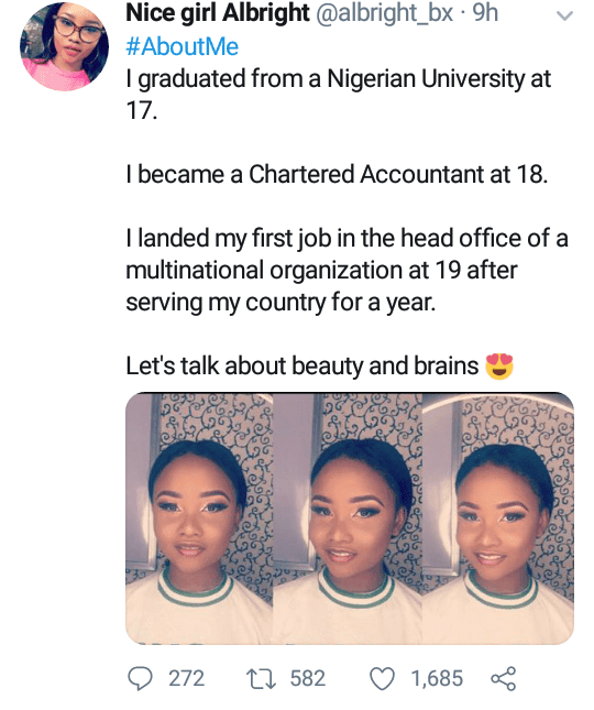 Not only that, she says she became a chartered accountant at the age of 18, and at only 19, she’s done with NYSC and is alreadyworking.