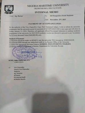 Nigerian Maritime University (NMU) acceptance fee payment has commenced for the 2023/2024 academic session. Details as published by the university’s management is as follows;