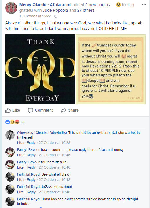 A 16-year old 100-level student of Microbiology at the Obafemi Awolowo University, OAU, Ile-Ife, Mercy Afolaranmi, killed herself more than a week ago. Miss Afolaranmi took ‘Sniper’ days after she wrote on Facebook that she wanted to see God’s face and speak with him face to face.