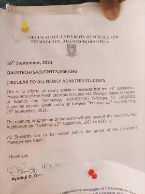 This is to inform all newly admitted students that the 11 Orientation Programme of the Fresh Students Admitted into Olusegun Agagu University of Science and Technology, (OAUSTECH) Okitipupa, for 2020/2021 academic session would come up between Thursday, 23 and Saturday, 25th September, 2021.