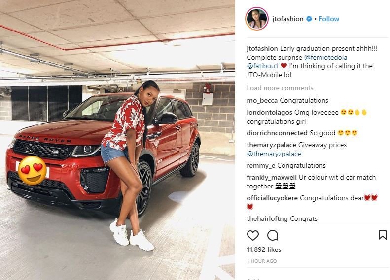 She was really excited after her father surprised her with a brand new Range Rover Evoque as a graduation gift. Temi who couldn’t hide her happiness took to her social media page to share the news.