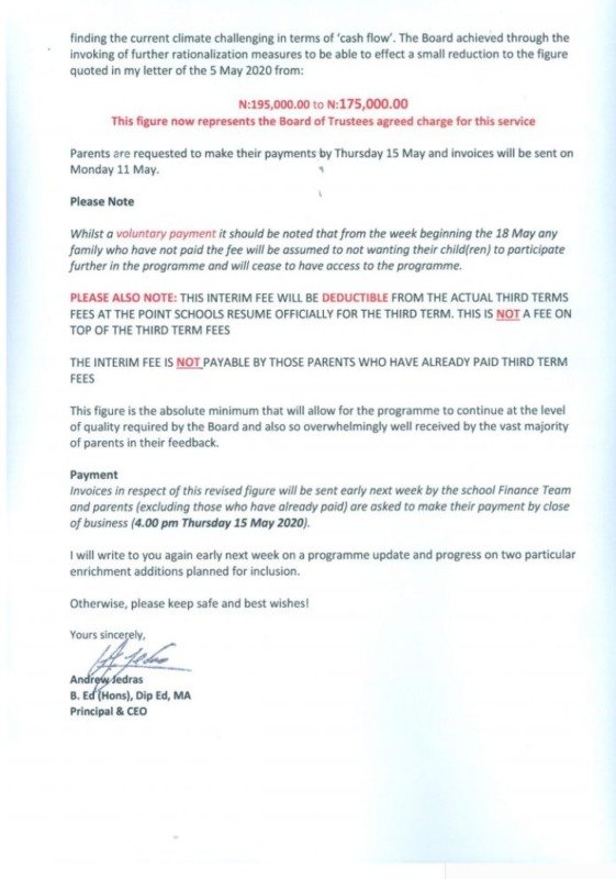 The School had imposed an initial monthly fee of N195,000 per student for online lessons pending when schools reopen after the relaxation of the COVID-19 restrictions. This led to an immediate protest by parents and resulted in a N20,000 reduction to N175,000.
