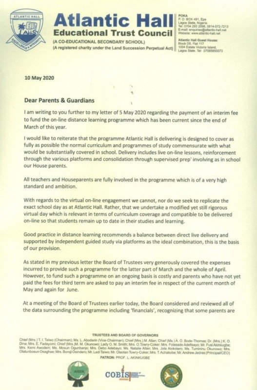 Parents of the Atlantic Hall School has rejected the N175,000 monthly fee for Online Learning imposed by School, after paying N4.5million annual school fees. See details below.