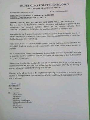 Rufus Giwa Poly, RUGIPO Resumption Date: This is to inform the Polytechnic Community in general and students in particular that Management has declared Christmas break for all students effective from Thursday, 14th December, 2023, before the usual December hike in transport fare.