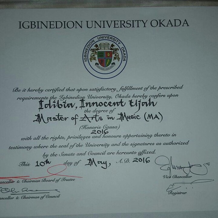 Music don, Innocent Idibia popularly known as Tuface Idibia on Tuesday, May 10th 2016, marked a very special day for him as he was conferred with an honorary degree – Master of Arts in Music (MA) by the Igbinedion University, Okada.