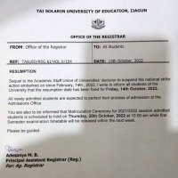 Sequel to the Academic Staff Union of Universities’ decision to suspend the national strike action embarked on since February, 14th, 2022, I write to inform all students of the University that resumption date has been fixed for Friday, 14th October, 2022.