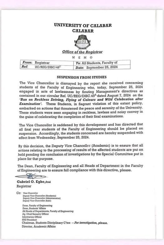 Authorities of the University of Calabar (UNICAL) has suspended all final-year students from the Faculty of Engineering over what it described as wild celebrations after their examinations. The notice has issued by the management is as follows;