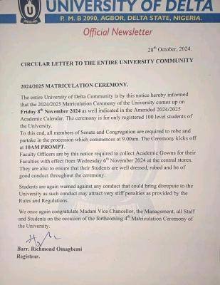 The entire University of Delta Community is by this notice hereby informed that the 2024/2025 Matriculation Ceremony of the University comes up on Friday 8th November 2024 as well indicated in the Amended 2024/2025 Academic Calendar. The ceremony is for only registered 100 level students of the University.