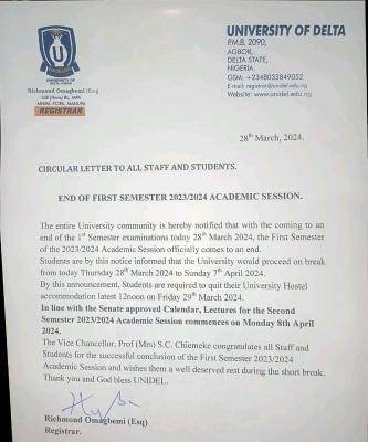The University of Delta (UNIDEL) has announced the end of first semester of the 2023/2024 academic session and also the resumption date for second semester.