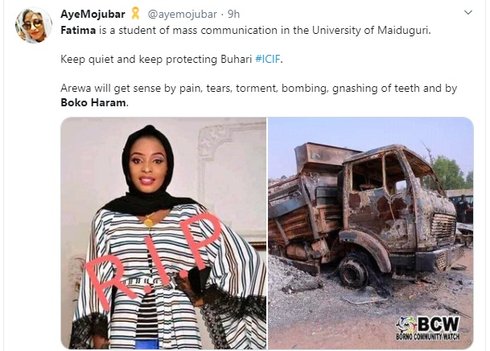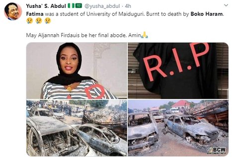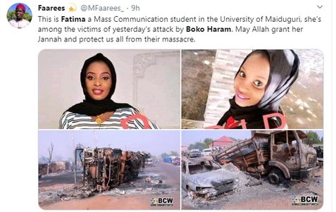 A female student of the Department of Mass Communication, University of Maiduguri (UNIMAID), Fatima has been identified as one of the 30 people killed by Boko Haram terrorists in an attack launched in Auno village, Borno on Sunday February 9, 2020.