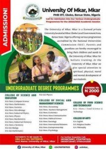 Applications are hereby invited from suitably qualified candidates for admission into the various undergraduate degree programmes of the University of Mkar, Mkar (UMM) for the 2022/2023 academic session.