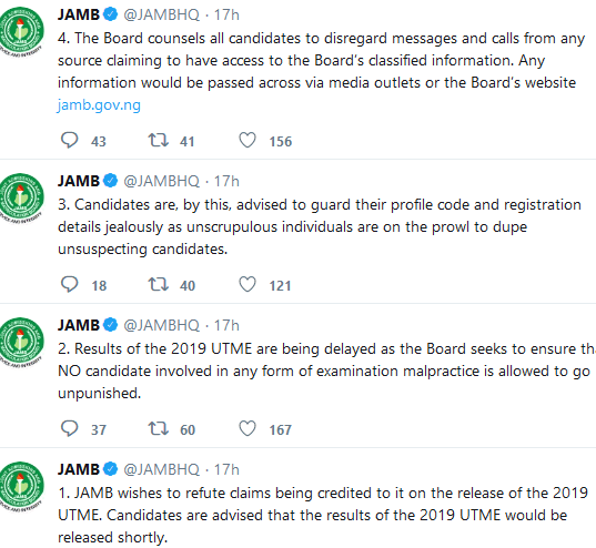 According to one of the tweets by the board, candidates are advised that the results of the 2019 UTME would be released shortly.
