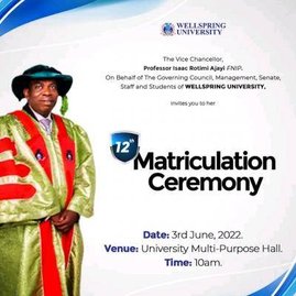 The Vice Chancellor,Professor Isaac Rotimi Ajayi FNIP on Behalf of The Governing Council, Management, Senate,Staff and Students of WELLSPRING UNIVERSITY, invites you to her 12th Matriculation Ceremony.