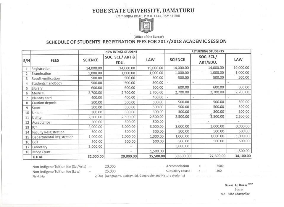 The management of Yobe State University (YSU) has released the School fees schedule for both new and returning students for the 2017/2018 academic session.
