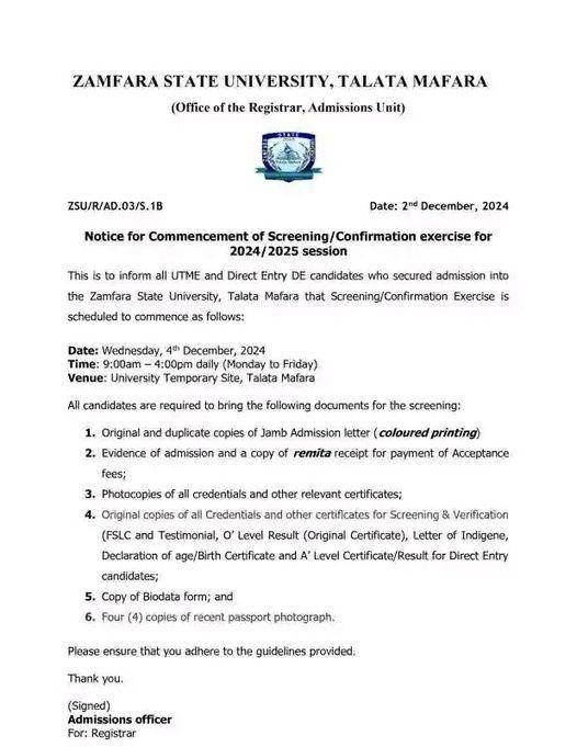 This is to inform all newly admitted students of the Zamfara State University, Talata-Mafara (ZAMSUT) that the University Management has listed out the schedule and requirements for confirmation of admission for the 2024/2025 academic session as follows;